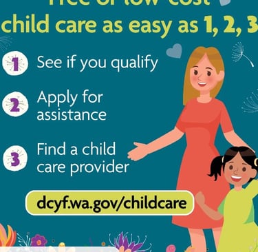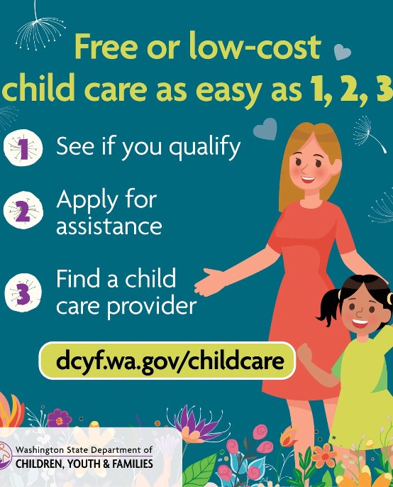 You may qualify for free or low-cost child care through a program offered by the Washington State Department of Children, Youth, and Families (DCYF).